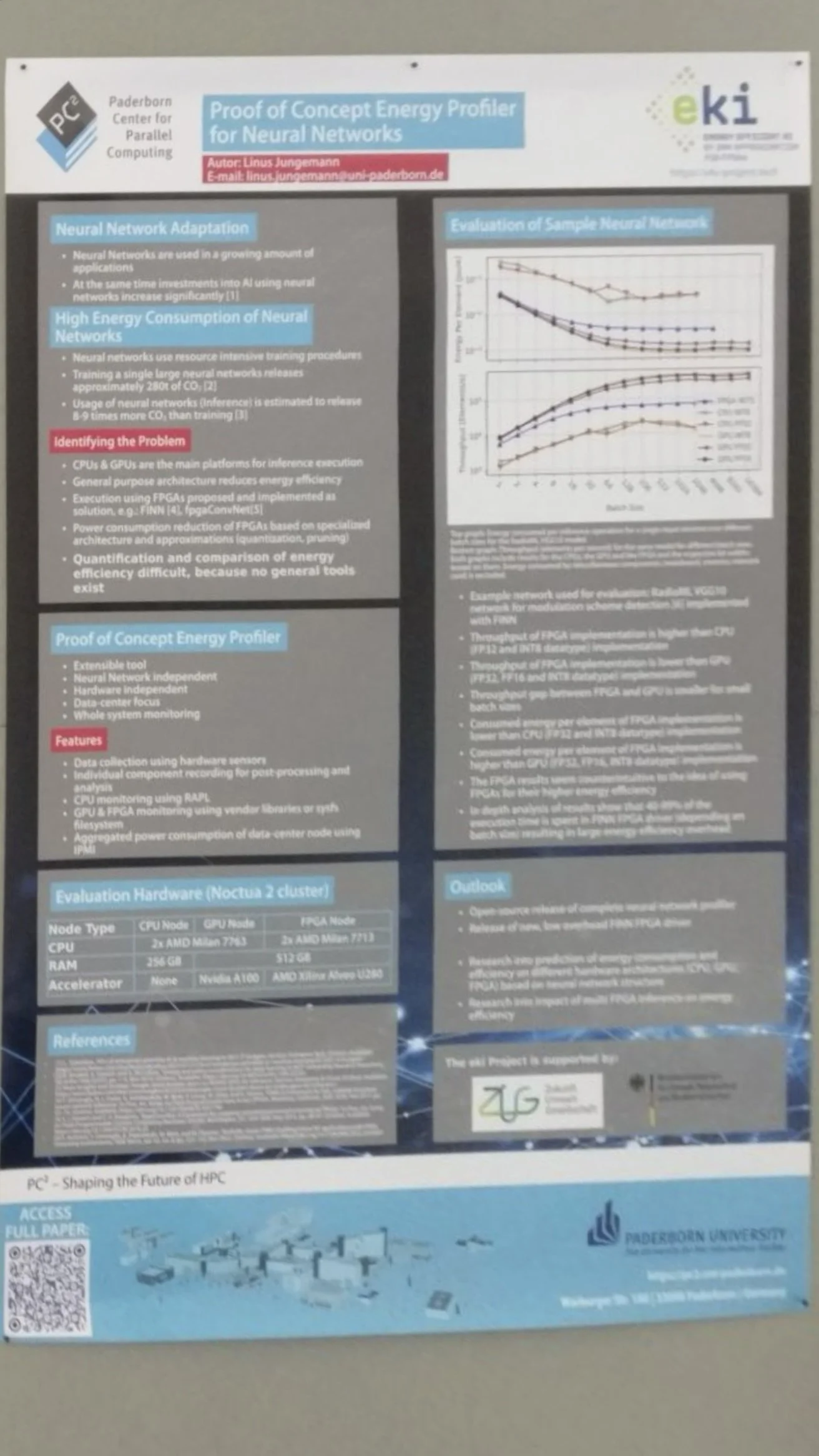 The poster featured a discussion of the current problems of neural network inference. Additionally the first implementation of an energy profiling tool designed to analyze the energy consumption of neural networks was presented and a first neural network evaluated as an example.